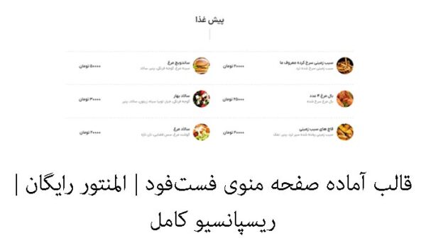 با این قالب آماده المنتور میتوانید منوی غذاهای رستوران یا فستفود خود را به شکلی جذاب و حرفهای نمایش دهید. طراحی مدرن، تصاویر غذاها، بخش قیمتگذاری و دکمههای سفارش باعث میشود مشتریان شما بهراحتی بتوانند انتخاب کنند.
